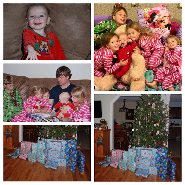 When we got home from the Watson Christmas party, the kids were able to give their once a year hugs to Simon, our Elf on the Shelf, before we put him back in the box for Santa to pick up on his way back to the North Pole. Ansley made him a necklace before he left, and they are wondering if he will wear it when he comes back next year:Christmas Eve tradition of reading The Night Before Christmas and having a sleepover in mom and dad's room! It wasn't long before Santa came: